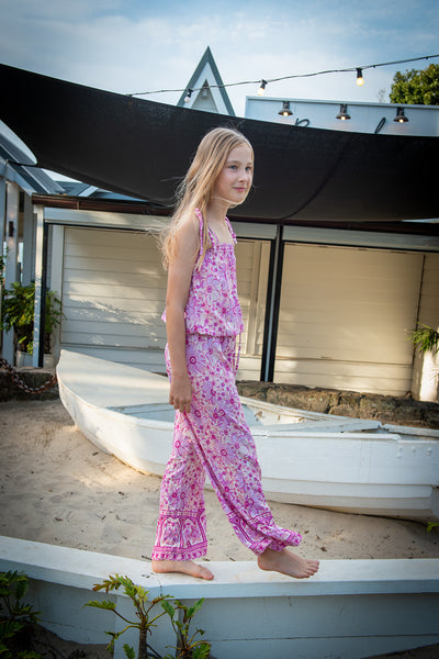 This cute pantsuit has an easy elastic waistband w a drawstring for those skinny minis so you can size uyp for leg length and still get the shape.